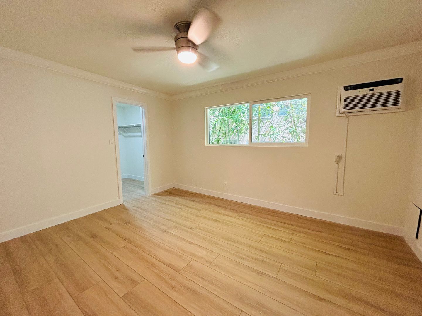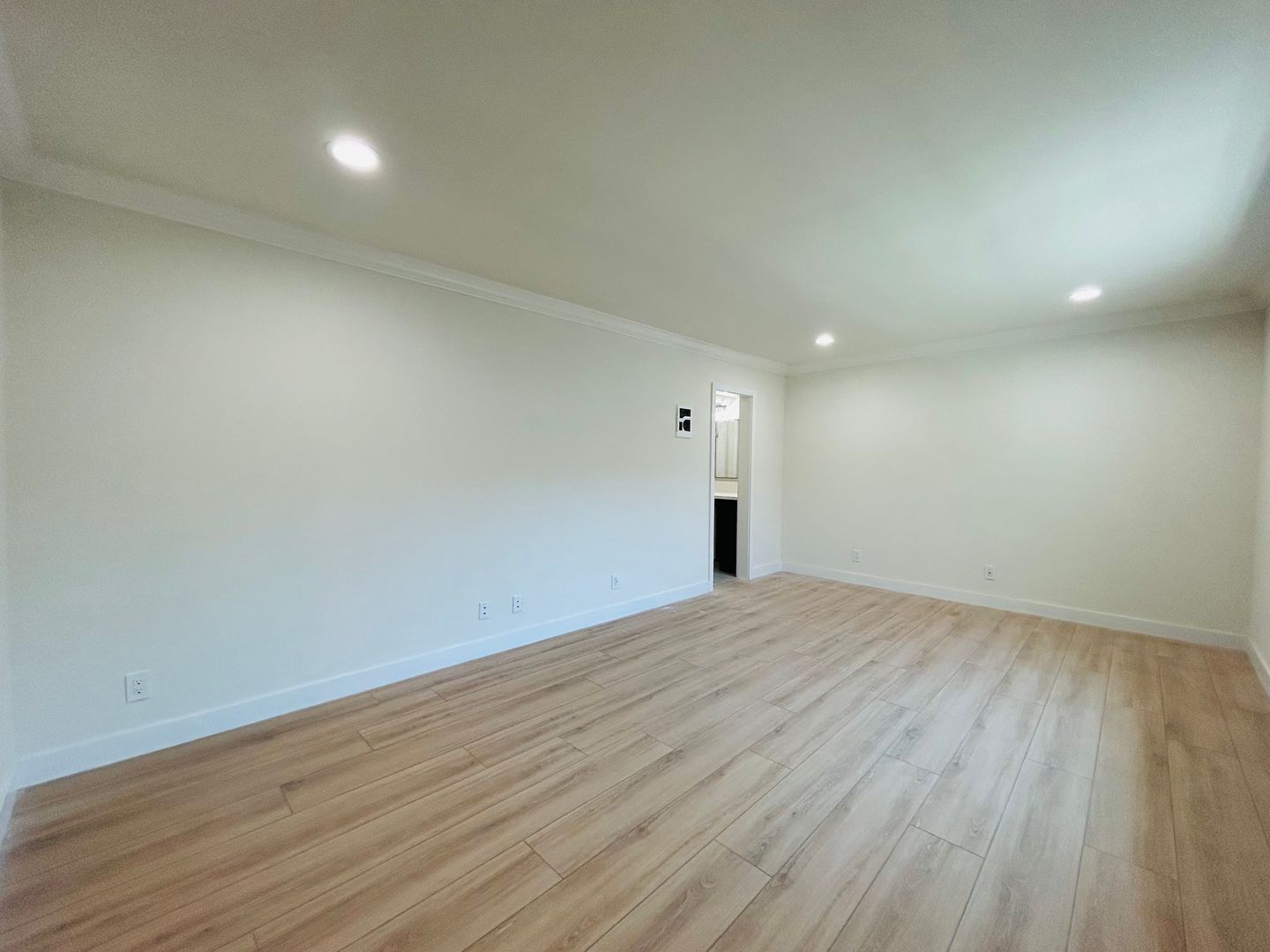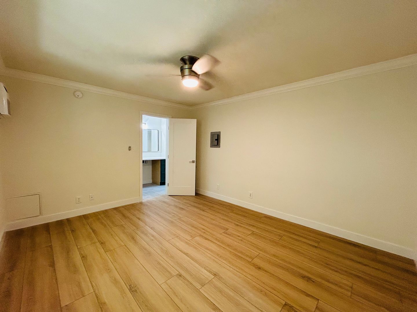 Centrally located between Westwood Village and Santa Monica, This spacious top-floor one-bedroom apartment home features in unit washer/dryer, air conditioning, wood-style vinyl plank flooring, stainless steel appliances, quartz countertops, and an oversized stainless steel sink. Its living room has an open layout with balcony access, creating an inviting environment with natural sunlight. The bedroom includes a ceiling fan and mirrored closet doors. The bathroom has an abundance of storage for linens and toiletries.