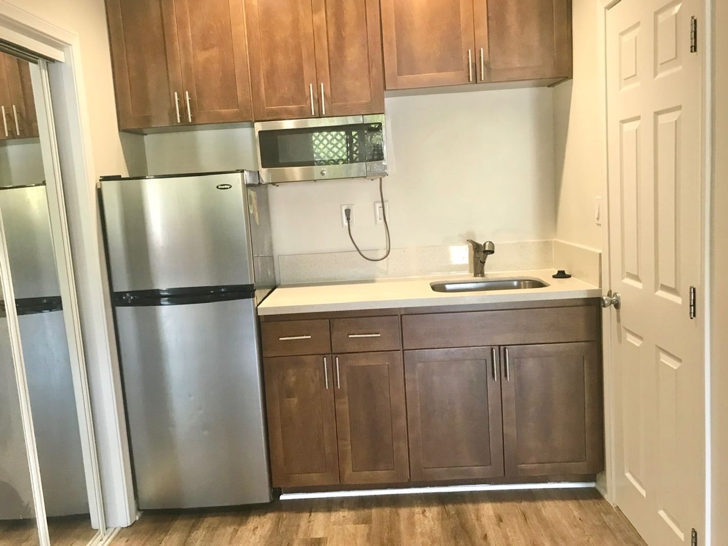 This spacious bachelor apartment home features wood-style laminate flooring, a refrigerator, a double burner hotplate, a microwave, air conditioning, and a private patio.
