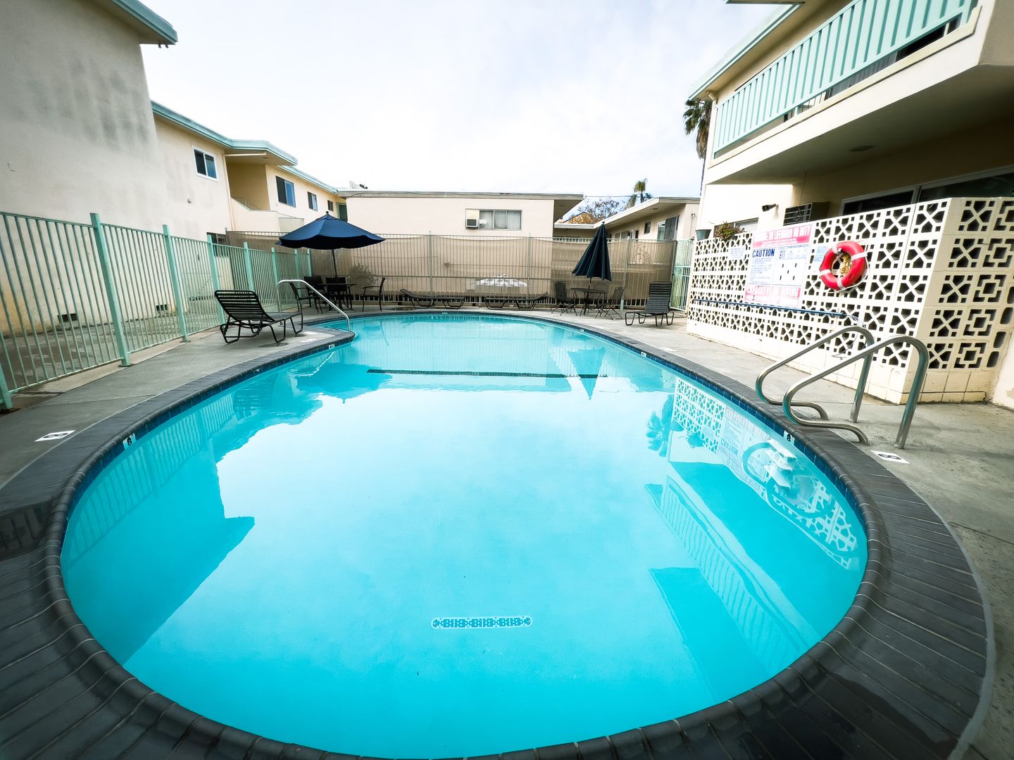 Property amenities include a relaxing pool with a pool-side lounging area, a gas-operated BBQ grill, assigned parking, controlled access entry, and onsite coin-operated laundry.